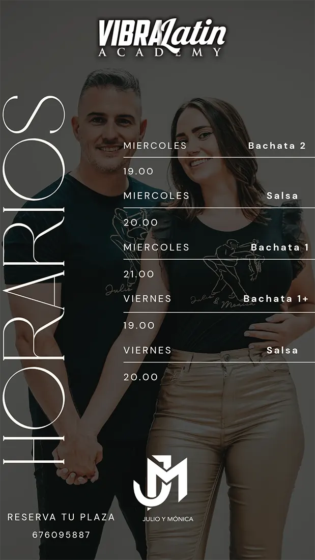 Nosotros somos los encargados de llevar la parte de bailes latinos; Salsa, Bachata y Kizomba. Contando con más de 20 años de experiencia en el sector y más de 12 años de docencia.